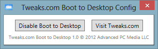 Microsoft went to great lengths to prevent users from altering this behavior by modifying the final builds of Windows 8 to disable the popular tweaks. Tweaks.com Boot to Desktop is a free app that provides a solution around Microsoft’s attempt and allows you to easily boot directly to the traditional desktop.