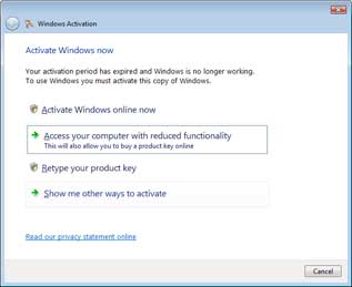 It starts when you log in and shown this error screen instead of being taken to your desktop. Your only options are to activate now or enter reduced functionality mode. In reduced functionality mode, you will only have access to Internet Explorer, so that you can buy a license for Windows Vista!