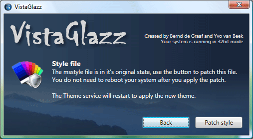 - Start up VistaGlazz again, this time click on the middle icon and hit Patch Style. The DWM will restart and everything will finally be transparent.