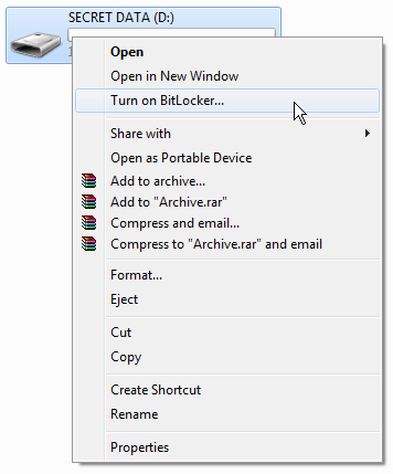 To get started you will need to plug in your USB flash drive and open Computer so you can view all your drives. Then, right click on your drive and select Turn on BitLocker.
