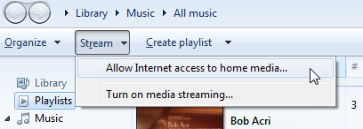 First, start up Windows Media Player and then click Stream and Allow Internet access to home media…