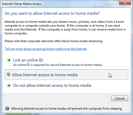 Next, switch back to Windows Media Player and click Allow Internet access to home media.