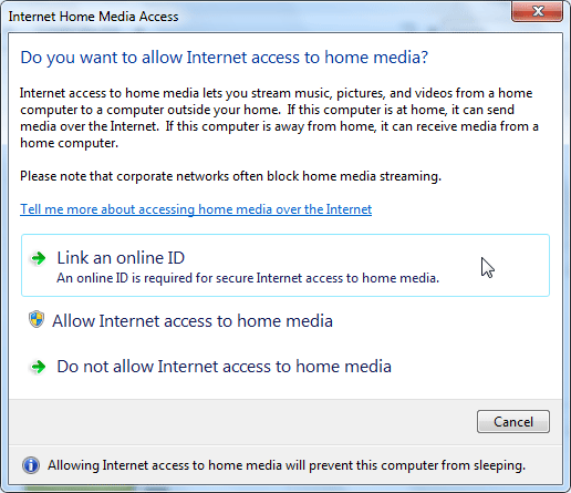 Windows 7 and Windows Media Player 12 include a very useful and cool feature called Internet Media Sharing. Integrated with an online ID provider such as Windows Live ID users can access their media located on a home Windows 7 computer remotely over the Internet on any other Windows 7 computer. For example, I have a desktop at home that is running Windows 7 Ultimate and a laptop running Windows 7 Pro. Remote Media Streaming allows me to connect to stream my music and videos from home over the internet to my laptop.