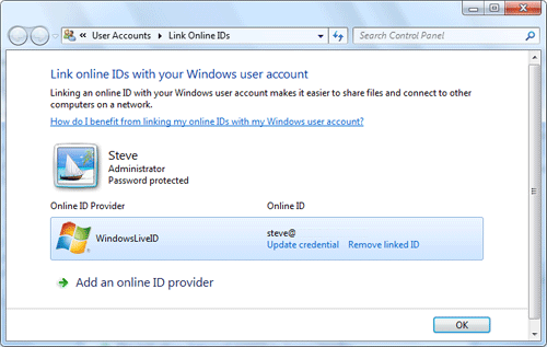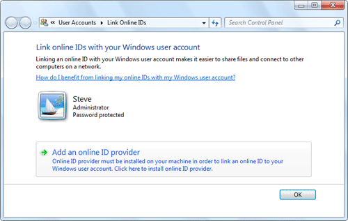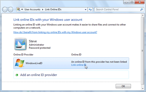 Now you will see the Windows Live ID listed as an online ID provider. Click Link online ID to setup your Windows Live ID.