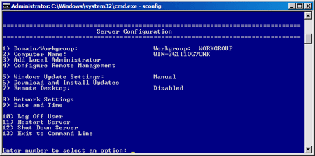 One of the first tasks an administrator must do after building a Windows Server Core machine is set the network address and configure the machine name and domain membership. There are command line tools for all of those individual features but Microsoft included a useful command called sconfig that allows you to quickly configure basic server settings.