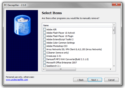Next you will be shown all of the applications installed on your computer. Check the items you want to have uninstalled and click Next.