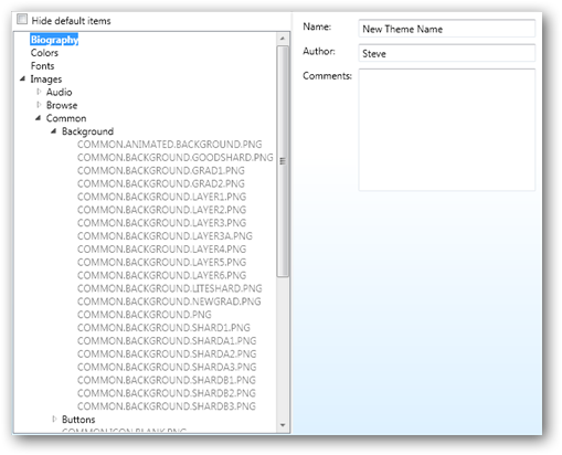Navigate through the sections on the left to customize each component. Most users like to change the background image so I’m going to cover that first. Navigate through Images, Common and Backgrounds. There are two items under Backgrounds that you will need to replace to change the Windows Media Center background.