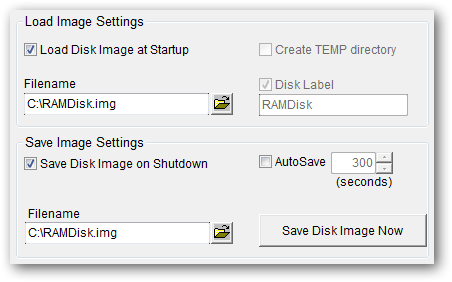 The main problem with RAM drives is the non-persistent nature of the disk. Turn off your computer and the contents of the RAM drive will be gone forever. The Dataram RAMDisk utility has a helpful feature that will allow you to save the state of your RAM drive upon shutting down and loading an image of it, from a file on your hard drive, on startup to restore any data. You can find these settings on the Load and Save tab of the RAMDisk Configuration Utility.