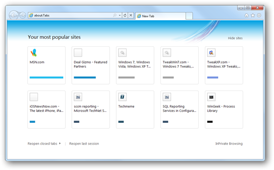 New to Internet Explorer in version 9 is a tab view that displays your most frequently visited sites so you can jump to a site with just one click. By default this new screen is only displayed when you click the New Tab button. A simple tweak allows you to view this page every time Internet Explorer 9 is started by setting it as your home page.