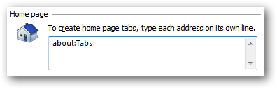 The key is to set the special browser page, about:Tabs as your home page. You can do this by bringing up the tools menu (hit Alt + X) and then select Internet Options. Set the Home page section to about:Tabs and click OK.