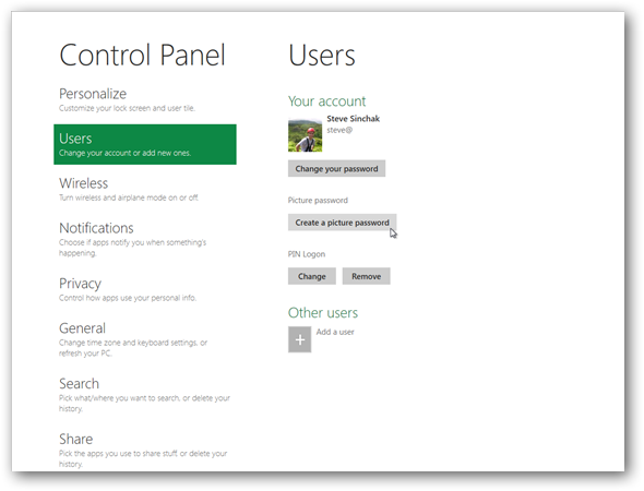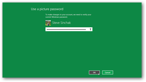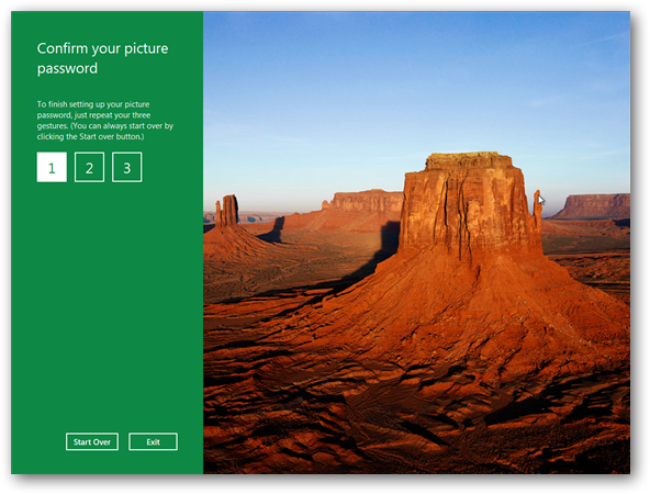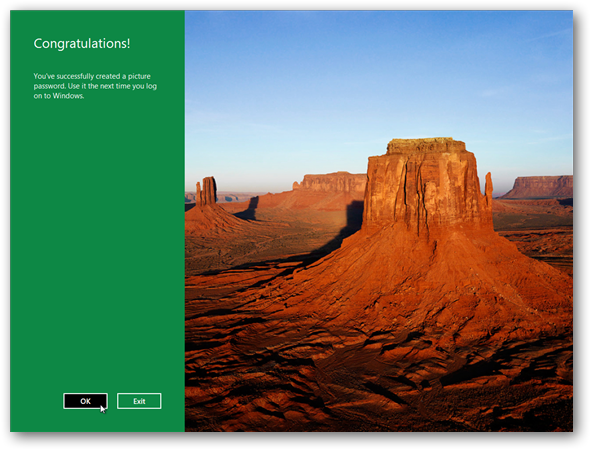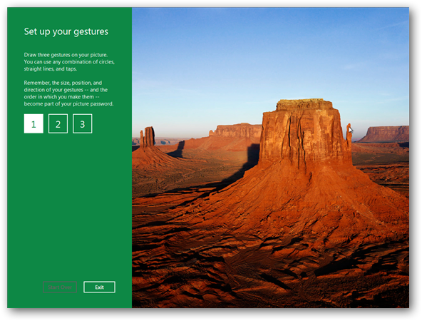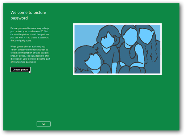 Picture Passwords are one of the more innovative new features in Windows 8 that enables you to logon by touching or clicking specific parts of a picture to authenticate. Any picture in your library can be used as a reference to help you remember where the three parts of your picture password are located. Basic gestures such as dragging your finger or mouse along a specific part of the picture can also be used in your password.