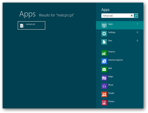 To get started go to the start screen and type in inetcpl.cpl and hit Enter.