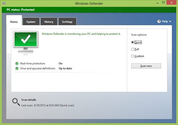 I have always liked the performance and reliability of Microsoft Security Essentials compared to third-party anti-virus utilities. So far performance and reliability appear to be the same with its twin, Windows Defender on Windows 8.