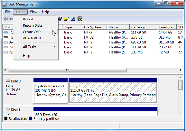 The first step to installing Windows 8 to a VHD file is to create the VHD file. This can be accomplished with the diskpart utility but I think it is much easier to use the graphical disk management utility. Open the Start Menu and type in diskmgmt.msc and hit enter.