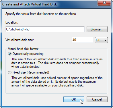 For best performance select a fixed size disk but I typically use dynamically expanding disks to save on disk space. The difference is a fixed size disk of 40 GB will create a 40 GB VHD file on your file system right away. Where a dynamically expanding disk grows only as space is used. For example, a 40 GB dynamic VHD after installing Windows 8 could take up only 14 GB of actual disk space.
