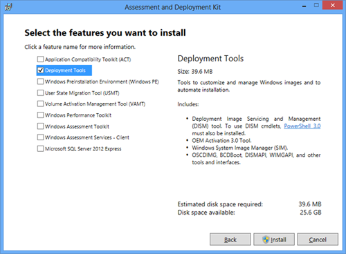 - Install the Windows Assessment and Deployment Kit for Windows 8. Free download from Microsoft. More details available here. Upon install you only need the Deployment Tools option checked.