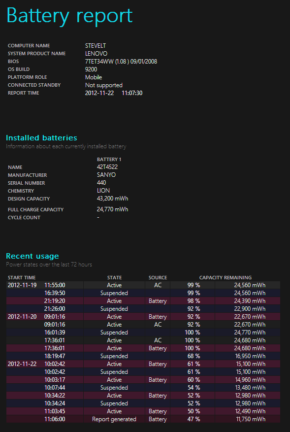 Windows 8 includes a very useful feature for laptop users that lets you see the charging history and capacity of your battery. Over time batteries hold less and less of a change so this report is very helpful to identify if it is time to buy a replacement.