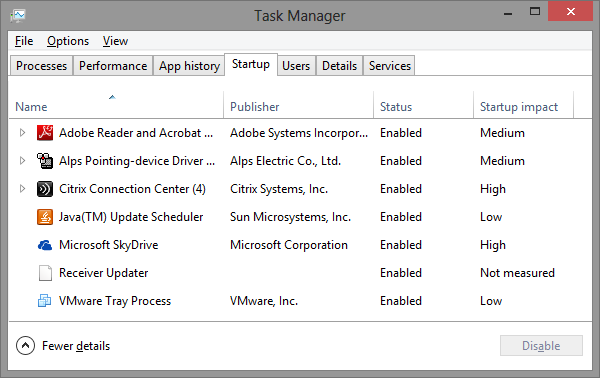 But how do you know which applications should be disabled? Not all applications that startup automatically are equal. Some are tiny applications that have little if any impact while others are resource hogs that significantly impact your startup performance. This is where the Startup Impact column of Task Manager is very helpful. on the Startup tab you will find each item listed is assigned a rating of none, low, medium, high, and not measured.