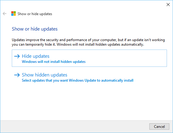 Select the Hide Updates button. You can also un-hide previous updates with the second option if you want to reverse any actions you have previously taken.