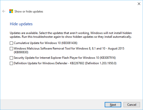 Check the box next to the update you want to hide and click Next.
