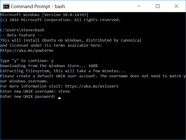 10. After Ubuntu on Windows is installed, you will be prompted to setup the root account (equivalent to Windows administrator account). This account is different than your Windows account and can be whatever you want. Enter in a username, hit Enter. Do the same to setup a password.