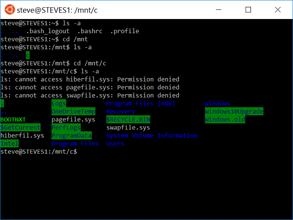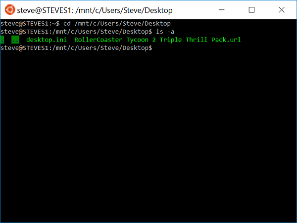 Tip: If you need to access files stored on any of your hard drives you can find them mounted in the /mnt folder under the Windows drive letter. To get to my desktop I type in cd /mnt/c/Users/Steve/Desktop and then hit Enter. Keep in mind Linux is case sensitive so you will need to use the proper folder names with capitalization.